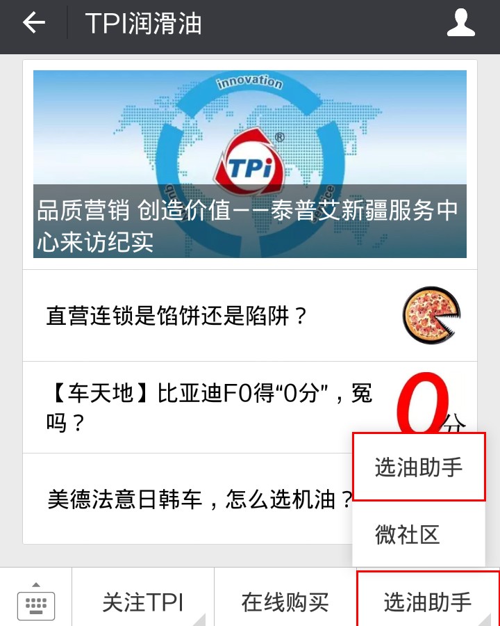 關(guān)注泰普艾潤(rùn)滑油微信公眾號(hào)(TPI4007006919),進(jìn)入微信公眾平臺(tái),點(diǎn)擊選油助手,即可進(jìn)入泰普艾潤(rùn)滑油選油助手頁(yè)面