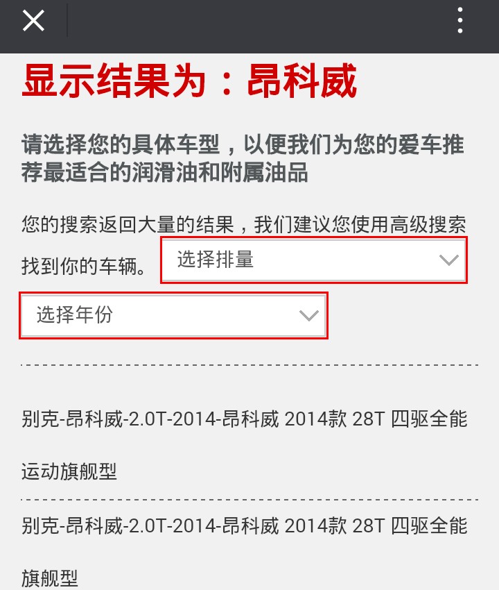 選擇車(chē)輛的排量、年份后,“潤(rùn)滑管家”將自動(dòng)篩選車(chē)型,車(chē)主根據(jù)車(chē)輛配置點(diǎn)擊相關(guān)選項(xiàng)即可