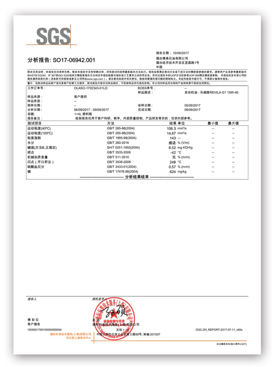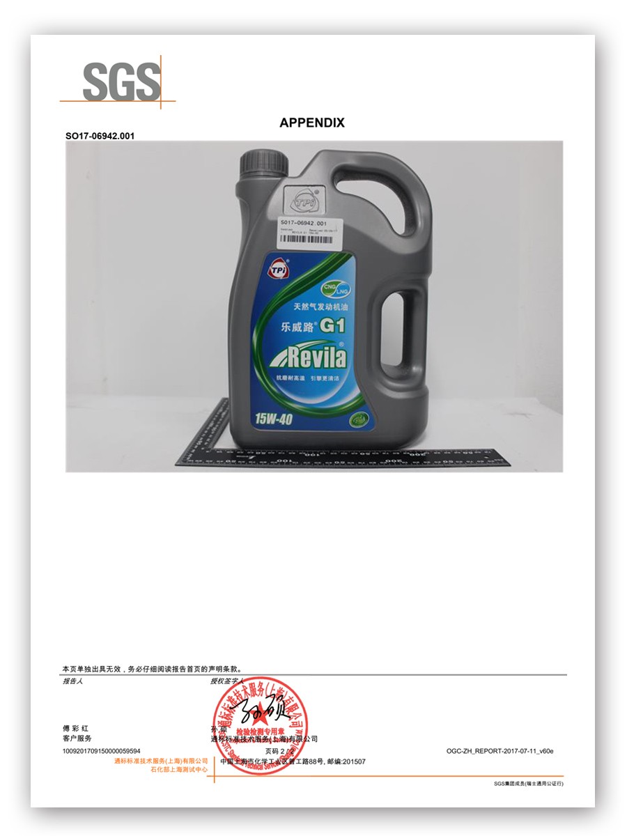 LubTop2017總評(píng)榜指定檢測(cè)機(jī)構(gòu)、全球權(quán)威第三方檢測(cè)機(jī)構(gòu)SGS品質(zhì)檢測(cè)顯示,與同級(jí)別天然氣機(jī)油相比,樂(lè)威路G1黏度指數(shù)較高,表明油品具有優(yōu)異的黏溫性能,即油品處于高溫與高工作強(qiáng)度下,依然能保證自身潤(rùn)滑效果,有效減輕各部件之間的摩擦損失。本次送檢的G1產(chǎn)品黏度為15W-40,該黏度產(chǎn)品傾點(diǎn),國(guó)標(biāo)要求不高于-25℃,泰普艾天然氣機(jī)油的傾點(diǎn)達(dá)到-42℃,這使天然氣系列產(chǎn)品擁有優(yōu)異的低溫流動(dòng)性,保證即使在嚴(yán)寒地區(qū),發(fā)動(dòng)機(jī)冷啟動(dòng)瞬間也會(huì)有機(jī)油潤(rùn)滑,不會(huì)產(chǎn)生磨損。此外,泰普艾天然氣產(chǎn)品的低灰配方是在優(yōu)化各項(xiàng)指標(biāo)前提下的科學(xué)配比,能夠保證機(jī)油性能的最大化發(fā)揮。樂(lè)威路G1檢測(cè)報(bào)告的亮眼數(shù)據(jù),再次有力印證泰普艾產(chǎn)品超越標(biāo)準(zhǔn)的卓越性能,為發(fā)動(dòng)機(jī)提供全方位保護(hù),為車(chē)主提供最佳潤(rùn)滑選擇。