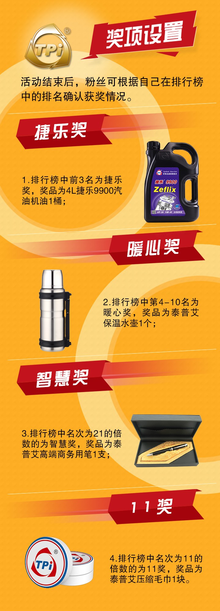 2.中獎(jiǎng)人需在11.14-11.16日間將【獎(jiǎng)項(xiàng)名+微信昵稱+姓名+電話+郵寄地址】以信息形式發(fā)送至泰普艾潤滑油官方微信,逾期作廢;